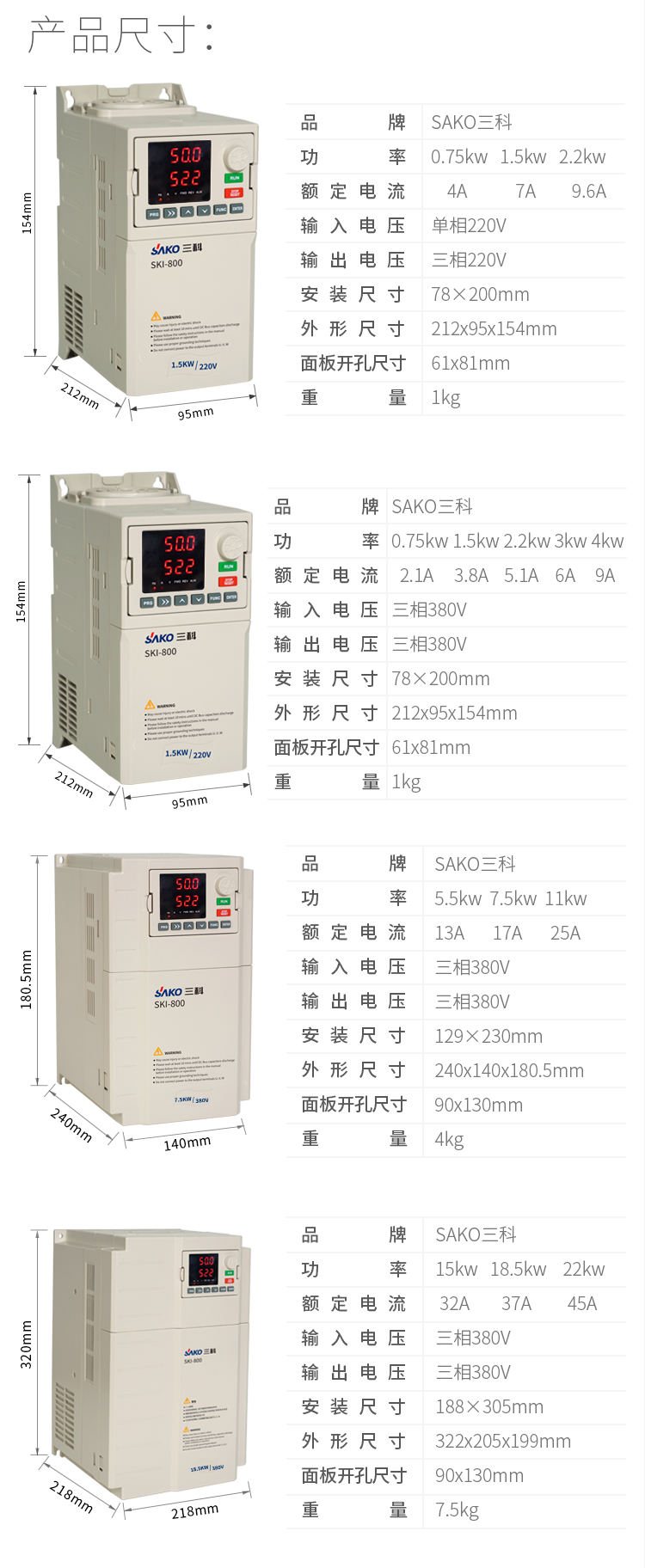 三科變頻器技術領先,環(huán)保節(jié)能,可搭配變頻柜應用在風機、水泵、空壓機、注塑機、卷繞機、中央空調,紡織機、化工、冶金、礦業(yè)、制藥、陶瓷、造紙、油田、塑料、印刷、熱電、煙草、食品等各類機械設備中。產品型號 | SKI800A15D0G-4 | SKI800A18D5G-4 | SKI800A22D0G-4 |