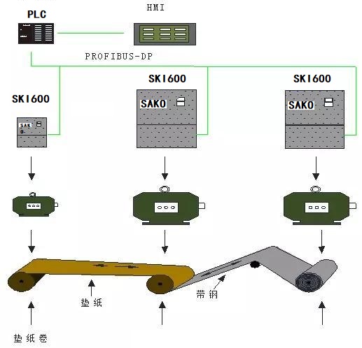 HMI作為操作工藝參數(shù)的輸入部分,是人機(jī)交互界面,通過(guò)輸入不同的參數(shù)來(lái)實(shí)現(xiàn)不同鋼材卷取要求。PLC作為控制器進(jìn)行運(yùn)算控制,協(xié)調(diào)各個(gè)變頻器工作。為了滿足高速響應(yīng)性,系統(tǒng)采用PLC和以及三科SKI600進(jìn)行PROFIBUS-DP協(xié)議通信