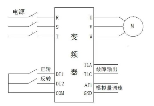 例如一個(gè)開關(guān)收到變頻器的正轉(zhuǎn)接線端子(一些是FWD,這兒是DI1),此刻變頻器會正轉(zhuǎn),開關(guān)自然要挑選維持式的,當(dāng)開關(guān)斷掉后,變頻器會立即終止。