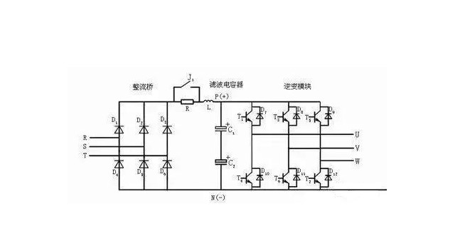 缺相故障是變頻器常見故障中的一種,要知道單相220V與三相380V是變頻器產品主要的分別,當然輸入缺相檢測只存在于三相的產品中。圖1所示為變頻器主電路,R、S、T為三相交流輸入,當其中的一相因為熔斷器或斷路器的故障而斷開時,便認為是發(fā)生了輸入缺相故障。