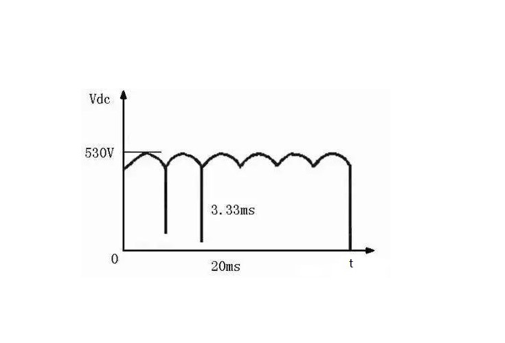 當變頻器不發(fā)生缺相的正常情況下工作時,Udc上的電壓如圖2所示,一個工頻周期內將有6個波頭,此時直流電壓Udc將不會低于470V,實際上對于一個7.5kW的變頻器而言,其C的值大小一般為900uf,當滿載運行時,可以計算出周期性的電壓降落大致為40V,紋波系數不會超過7.5%。而當輸入缺相發(fā)生時,一個工頻周期中只有2個電壓波頭,且整流電壓最低值為零。此時在上述條件下,可以估算出電壓降落大致為150V,紋波系數要達到30%左右。