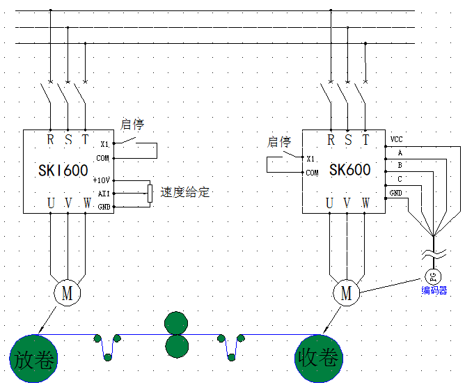 該現(xiàn)場(chǎng)放卷設(shè)備由1臺(tái)三科的SKI600-2D2G-1驅(qū)動(dòng)一臺(tái)2.2KW電機(jī)進(jìn)行速度控制,收卷設(shè)備則由1臺(tái)SKI600-3D7G-1驅(qū)動(dòng)一臺(tái)3.7KW電機(jī)進(jìn)行力矩控制。另外,在收卷部分的SKI600上加裝編碼器。