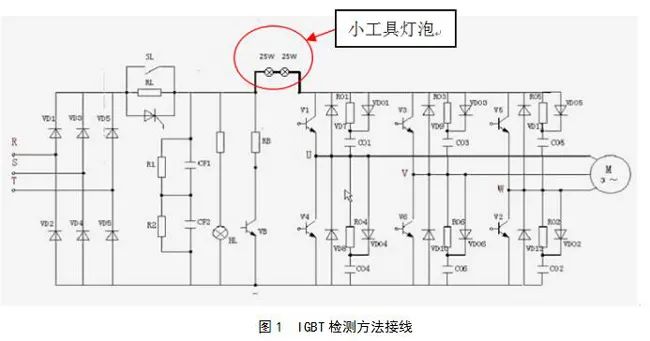 在具體運用中,電路這些一般為聯(lián)接接地銅排或快熔,把聯(lián)接獎牌和快熔除掉,將三相逆變電源IGBT正開關(guān)電源與直流電儲能技術(shù)電容器中間斷掉,把電燈泡接在兩點之間就可以。IGBT檢驗方式布線如圖所示1所顯示。