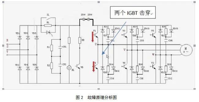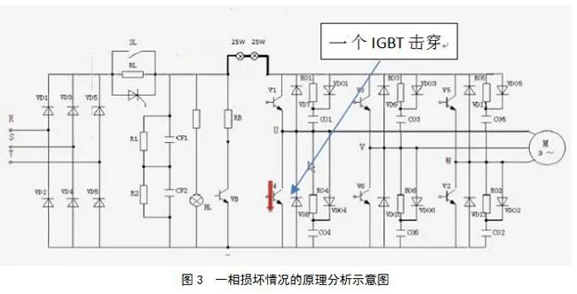 圖2為故障基本原理分析圖表,假定U相的2個IGBT都穿透了,等同于U相短路故障,這時一上燈泡即亮。