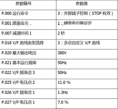 主機(jī)啟動(dòng)命令外部端子給定,頻率命令面板電位器給定,變頻器低頻運(yùn)行,而且傳動(dòng)輪之間的摩擦力較大,要求有高的啟動(dòng)轉(zhuǎn)矩。
