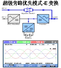 超級旁路優(yōu)先運(yùn)行模式(E變換模式)。正常情況下,逆變器與旁路市電并聯(lián)工作,相當(dāng)于有源濾波器,逆變器提供諧波電流和無功功率,旁路市電回路提供基波電流和有功功率。輸出電壓由旁路決定。