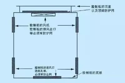 (2) 控制柜頂部出風(fēng)口上面要安裝防護頂蓋,防止雜物直接落入;防護頂蓋高度要合理,不影響排風(fēng)。防護頂蓋的側(cè)面出風(fēng)口要安裝防護網(wǎng),防止絮狀雜物直接落入。