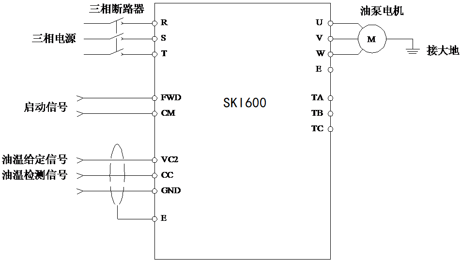 根據(jù)窯爐風(fēng)機系統(tǒng)控制的要求,采用三科SKI600通用重載變頻器來實現(xiàn)系統(tǒng)的全自動溫度控制。即由溫度傳感器采集窯爐的當(dāng)前溫度,并通過模擬量通道反饋給變頻器,然后與設(shè)定的溫度值做比較,再由變頻器的PID控制器改變輸出頻率以調(diào)節(jié)風(fēng)機的轉(zhuǎn)速,進而控制系統(tǒng)風(fēng)量,以保證系統(tǒng)的溫度控制精度及響應(yīng)性。其系統(tǒng)原理圖如下圖2所示: