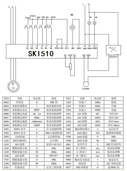 一,設(shè)計(jì)思路:選用一臺 15KW 具有 PID 功能的變頻器,可以不考慮輸入電抗器,電機(jī)速度由設(shè)定頻率與泵出口壓力作比較進(jìn)行 PID 調(diào)節(jié),設(shè)計(jì)應(yīng)考慮能手 /自動(dòng)轉(zhuǎn)換。