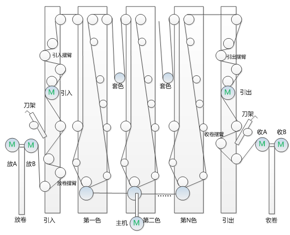 作為如今凹版印刷行業(yè)中較為普遍的控制系統(tǒng),七電機張力控制方案的系統(tǒng)構(gòu)成是由七臺電機進行變頻傳動控制,其中兩臺分別負責放卷、兩臺負責收卷、最后由一臺主機負責控制收、放卷牽引各一臺構(gòu)成,其中收卷、放卷、收放卷牽引都是帶張力反饋的閉環(huán)張力控制,當VFD以速度模式運行時;由于印刷單元在兩級牽引的中間,對套色精度有較高的標準,因此穩(wěn)定性對張力調(diào)節(jié)來說十分重要,所以主機和兩級牽引采用帶編碼器的閉環(huán)矢量控制。其他張力控制系統(tǒng)均是在七電機張力控制系統(tǒng)的基礎(chǔ)上進行增加或減少電機構(gòu)成的。
