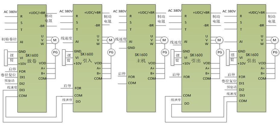 SKI600將卷徑計算、預(yù)驅(qū)動、張力控制、速度同步調(diào)節(jié)(輔助頻率)、收放卷切換等功能進行了整合集成,該系統(tǒng)中的PLC只需將相應(yīng)功能的信號給到印刷機變頻器即可。凹版印刷機在使用中會使用不同大小的印版,需要PLC處理印版大小不同時同步頻率,再以此為基礎(chǔ)確認引入和引出的同步頻率(主頻率),引入和引出變頻器再根據(jù)擺臂反饋回來的信號由PID自動計算出一個頻率(輔助頻率),二者相加,實現(xiàn)牽引的同步控制。通過牽引將運行頻率傳導至收卷和放卷做線速度信號,這里初始卷徑是由PLC給定的,線速度與初始卷徑相結(jié)合就得出了收放卷VFD的主頻率,同時根據(jù)擺臂反饋回來的信號通過PID的自動計算功能給出相應(yīng)的頻率(輔助頻率),當二者相加時,既看完成收放卷的橫張力控制。由于負責控制主機、牽引和收放卷部分的VFD是采用了速度閉環(huán)模式,這樣確保了控制的精度;