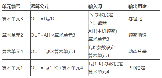 graph TD A[主機頻率F0] --> B[算術(shù)單元2] C[實時卷徑D] --> D[算術(shù)單元3] D -->|D0/D| B B --> E[頻率前饋] F[張力設(shè)定T0] --> G[算術(shù)單元1] H[錐度系數(shù)K] --> G D --> I[算術(shù)單元4] I --> G E --> J[頻率合成] G --> K[PID控制器] L[張力反饋] --> K K --> J J --> M[收卷電機]