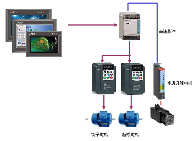 整套系統(tǒng)是由一臺SK-C的PLC和S系列的7寸觸摸屏以及2臺SKI600構(gòu)成,另外,每5臺整機另加一臺SKI600,一拖多控制頂輪的旋轉(zhuǎn),每臺機分前后兩面,共兩套。
