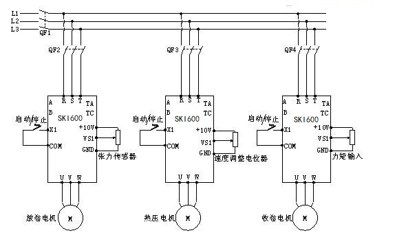 該放卷部分一共有三種材料,兩層無紡布中間夾一層熱熔膠薄膜,均采用杭州三科的SKI600系列的復合機變頻器作動力放線,利用張力輥反饋回來的0~10V信號與給定量信號作雙向PID運算,PID給定由外部電位器實現(xiàn),其中張力輥的配重由氣壓實現(xiàn)以適應不同材料不同張力的要求。放卷時要保證放卷輥與熱壓輥之間的材料張力基本一致否則容易出現(xiàn)材料褶皺。同時利用反饋信號保證SKI600在無材料或者材料斷線的情況下