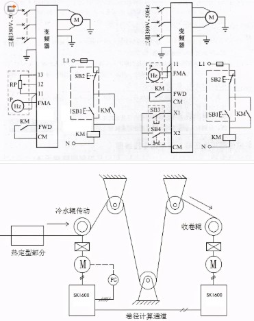 SKI600通用重型VFD的關(guān)鍵功能是線圈直徑計算、扭矩補償和張力錐度。一般來說,有三種方法可以檢測線圈直徑。第一種方法是通過傳感器直接測量線圈直徑。由于傳感器需要現(xiàn)場安裝,成本會增加,故障率也會增加,所以在實際中很少使用;第二種方法是厚度積分法,其優(yōu)點是控制簡單,但缺乏靈活性,需要在產(chǎn)品品種變化時調(diào)整參數(shù)。第三種方法是線速度計算方法,通過檢測車輪的轉(zhuǎn)速和滾筒的轉(zhuǎn)速來計算滾筒的當(dāng)前直徑。該方法具有較高的計算精度。由于系統(tǒng)已經(jīng)有了線速檢測和滾筒速度檢測,所以系統(tǒng)采用了冷水滾筒驅(qū)動VFDA0口模擬輸出的形式,這也是實際領(lǐng)域中應(yīng)用最廣泛的方法。