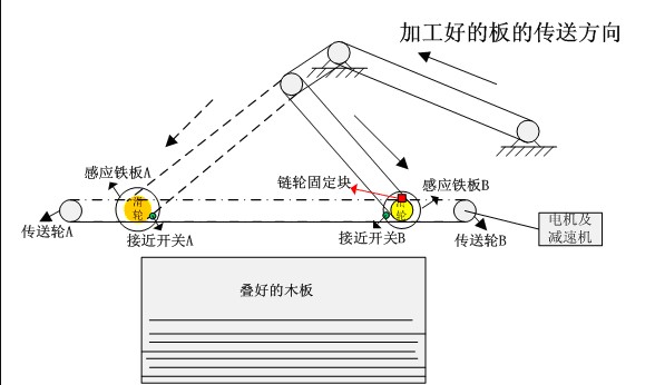 1.電機(jī)通過(guò)皮帶與減速器連接,減速器的輸出通過(guò)鏈輪與傳動(dòng)輪A、B連接,鏈輪與皮帶輪固定。鏈輪移動(dòng)時(shí),滑輪左右滑動(dòng),將傳送帶上的木板折疊起來(lái);