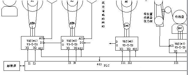 3、不銹鋼鍍鋅退火線拉絲機:金屬絲經(jīng)過酸洗、加熱、鍍鋅等工藝,從退火爐出來之后,經(jīng)過牽引輪,再經(jīng)過一積絲盤,最后收卷。要求VFD具有高精度的開環(huán)轉矩控制性能,并且,換盤時要有積絲和退積功能,保證在高速整機在高速運行進行換盤無沖擊、不斷線。系統(tǒng)接線圖: