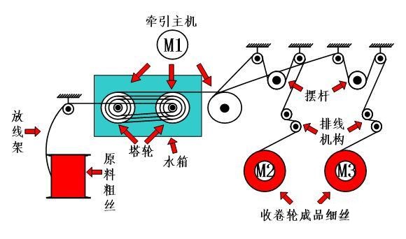 水箱式拉絲機(jī)的各個(gè)拉拔頭的工作速度就是基于以上的公式,保證各個(gè)拉拔頭同步運(yùn)行。由于水箱式拉絲機(jī)的拉絲過程完全通過機(jī)械軸拉拔完成,并且這些機(jī)械軸是在同一主軸下傳動(dòng)的,因此整個(gè)拉伸系統(tǒng)各級(jí)之間依靠拉伸輪的轉(zhuǎn)速差別和線上張力來控制同步協(xié)調(diào)工作。工作時(shí)需要冷卻液進(jìn)行散熱。收線部分用1臺(tái)小功率電動(dòng)機(jī)拖動(dòng),需要保持收卷時(shí)線上張力保持恒定,若這一段張力波動(dòng),收卷的工字輪上的繞線將會(huì)不均勻。水箱式拉絲機(jī)的收卷環(huán)節(jié)是此設(shè)備控制系統(tǒng)中的核心環(huán)節(jié),該環(huán)節(jié)也直接影響著鋼絲的質(zhì)量。