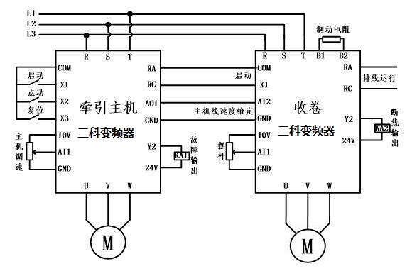 分別在牽引電機(jī)與收卷電機(jī)上應(yīng)用4級(jí)、2.2~7.5KW中使用三臺(tái)變頻器