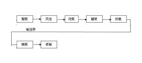 生產(chǎn)線共使用17臺變頻調(diào)速器,每小時產(chǎn)量15000瓶,分別用于風(fēng)力輸送、傳送帶輸送、洗瓶、裝罐、壓蓋。流程圖各部分的主要功能和工藝流程如下: